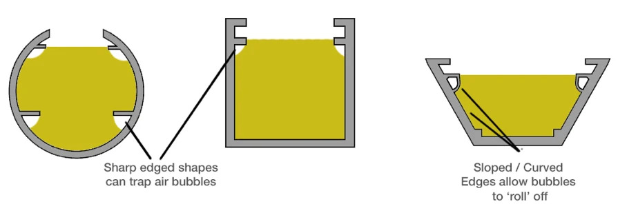 Karışık reçine, yolundaki herhangi bir engelin etrafında akacak şekilde tasarlanmıştır ancak alt kesimler veya çıkıntılar varsa, bunlar potansiyel olarak havayı hapsedebilir, bu da zayıf yapışmaya neden olabilir ve aynı zamanda kürlenme süresi boyunca kabarcık oluşumuna neden olabilir. Büyük bir reçine hacmi tek bir üniteye yerleştirilecekse, istenen miktarı 2 veya 3 şarj veya çekimde saksıyı dikkate almak faydalı olacaktır, bu daha sonra herhangi bir reçine büzülmesini hesaba katmanın yanı sıra sıkışan havayı en aza indirmeye yardımcı olur. Ayrıca aşamalı uygulama yaklaşımı, ünitede istenen optik efektleri vermek için opak veya renkli bir tabaka olabilen ikinci bir reçinenin kullanılmasına izin verir.
